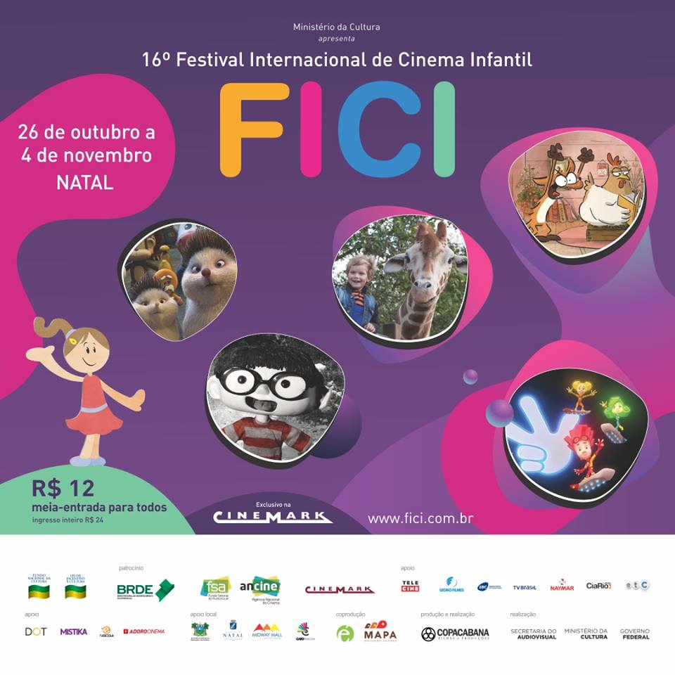 Pipoca, brincadeiras e uma tela de cinema gigante. Esse é o 16º Festival Internacional de Cinema Infantil – FICI que chega à capital potiguar de 26 de outubro a 04 de novembro, no Cinemark, do shopping Midway Mall, com meia-entrada (R$ 12) para todos e também sessões gratuitas para escolas públicas e projetos sociais.