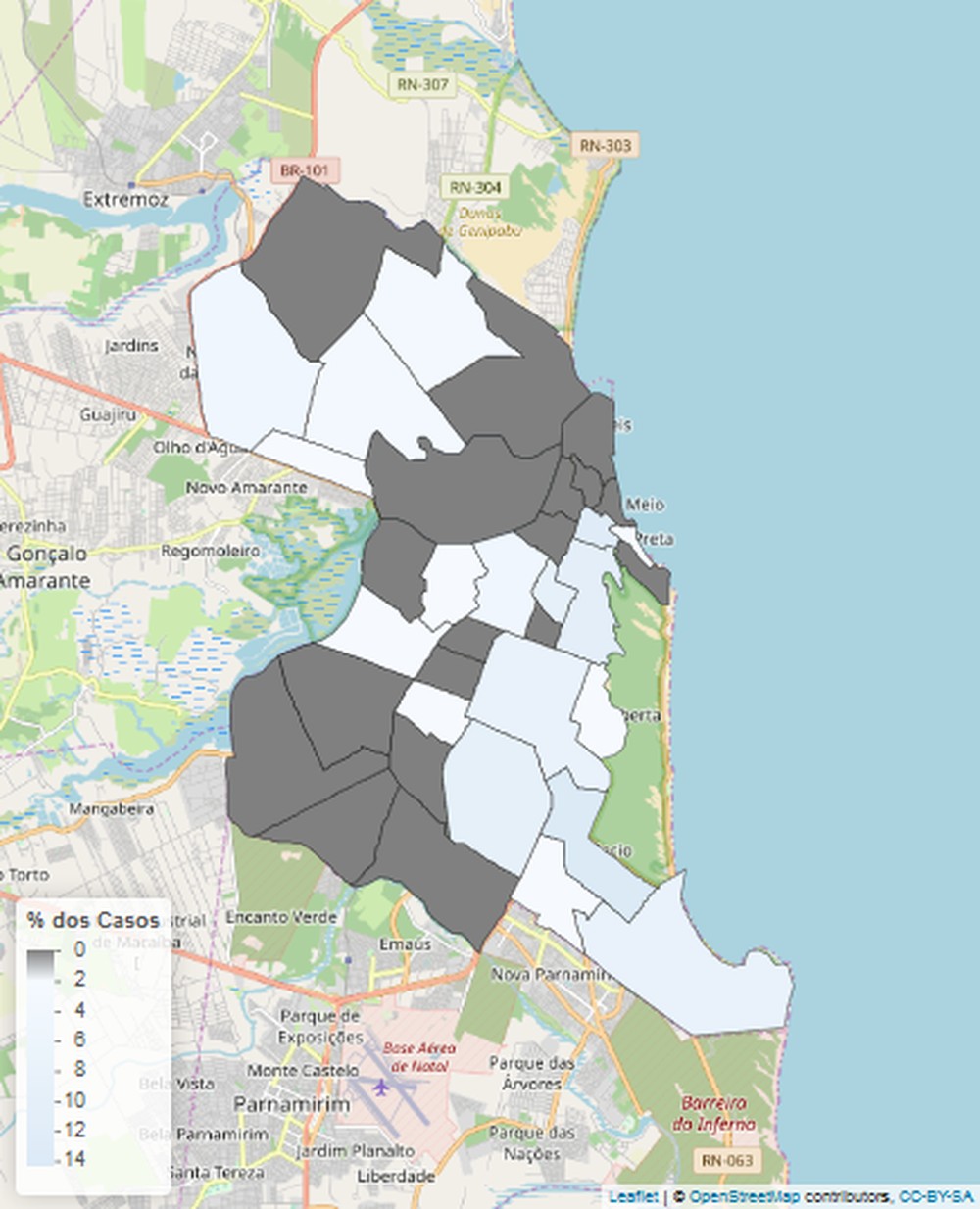 Naquele período, Tirol liderava o número de casos, seguido por Petrópolis e Ponta Negra. Capim Macio, na ocasião era o quarto bairro em número de casos.