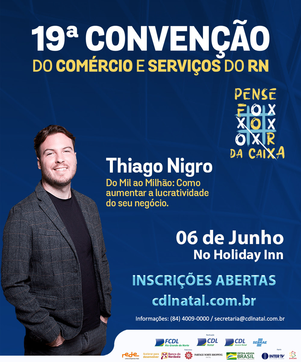 A 19ª convenção do comércio e serviços do RN terá o especialista em finanças Thiago Nigro, o filósofo Leandro Karnal, o consultor Fred Alecrim; o empresário Pedro Lima do café 3 corações, o fundador da agrícola famosa, Luis Barcelos, o sócio da Cherto, Américo José; o Ceo da Growth Machine, Thiago Reis; e o fundador da Next Academy, Yalli Oliveira.