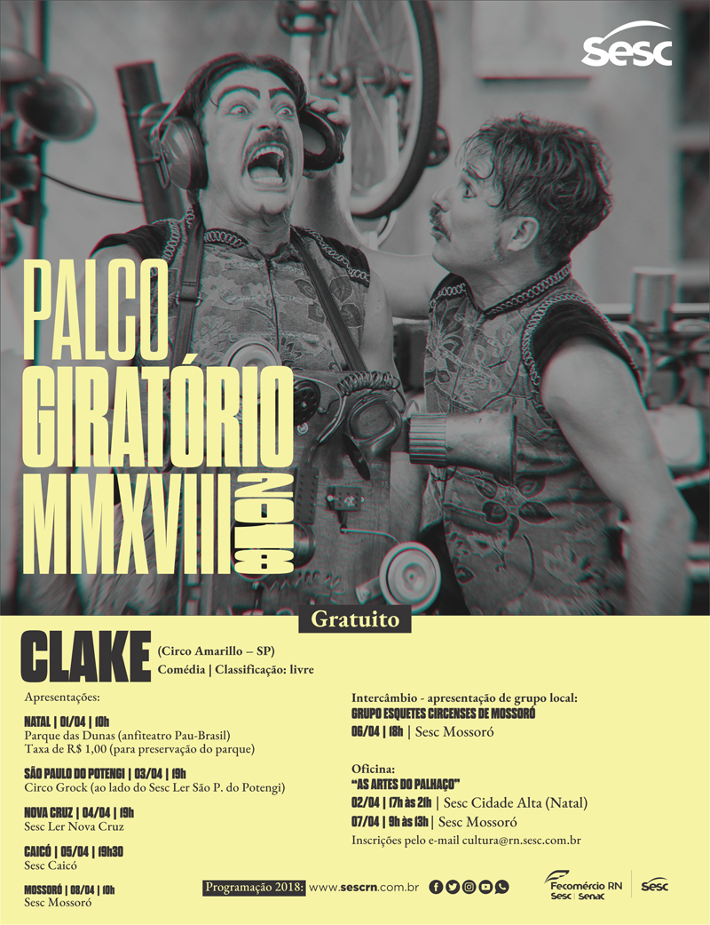 O 21º Palco Giratório vai começar a circular no Rio Grande do Norte em abril com o espetáculo Clake, do Circo Amarillo (SP). A peça será apresentada em Natal (no dia 1º), São Paulo do Potengi (dia 3), Nova Cruz (dia 4), Caicó (dia 5) e Mossoró (dia 8), esta precedida pela apresentação do grupo local Esquetes Circenses de Mossoró (dia 6). A programação é gratuita e realizada pelo Serviço Social do Comércio (Sesc RN), instituição do Sistema Fecomércio.