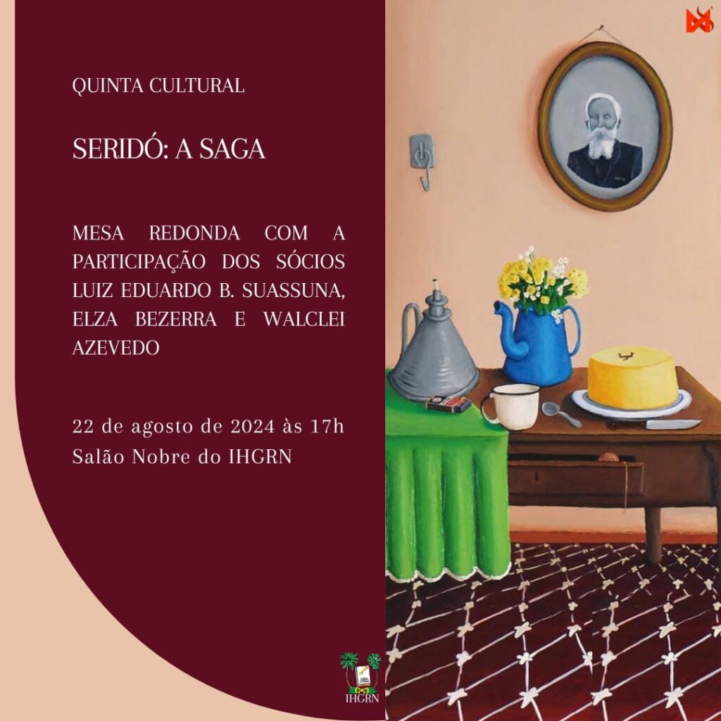 Na Quinta Cultura desta semana, o Instituto Histórico Geográfico do Rio Grande do Norte (IHGRN), promove uma mesa redonda com participação dos sócios Luiz Eduardo B. Suassuna, Elza Bezerra e Walcei Azevedo, com o tema: “Seridó: Saga”, nesta quinta-feira (22), às 17h no salão nobre do IHGRN.