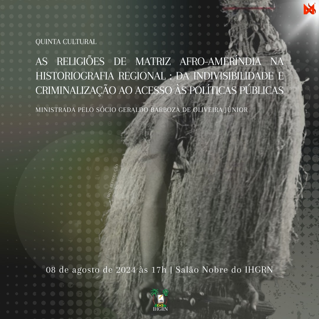 Nesta quinta-feira (08), o Instituto Histórico Geográfico do Rio Grande do Norte (IHGRN), por meio de seu sócio Geraldo Barboza de Oliveira Júnior, a palestra “As Religiões de Matriz Afro-Ameríndia na construção da historiografia regional: da invisibilidade e criminalização ao acesso às políticas públicas”, às 17h no salão nobre do IHGRN.