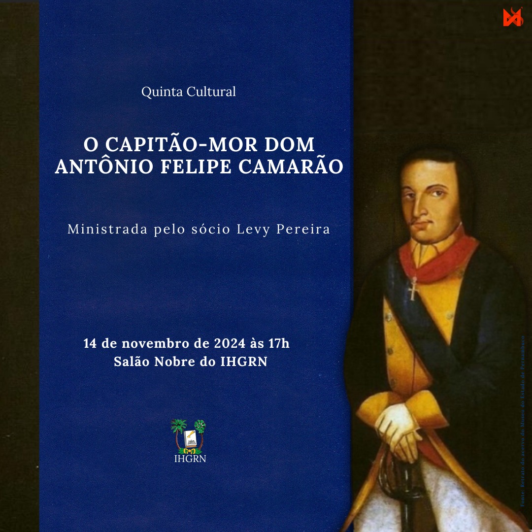 Na Quinta Cultural do Instituto Histórico Geográfico do Rio Grande do Norte (IHGRN), desta quinta-feira (14), às 17h, o sócio Levy Pereira ministrará a palestra sobre “O Capitão-Mor Dom Antônio Felipe Camarão”, no salão nobre do IHGRN.