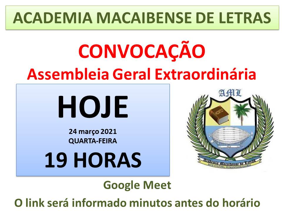 Nesta quarta-feira (24) a Academia Macaibense de Letras realiza uma assembleia geral extraordinária às 19h. O encontro será feito por meio do aplicativo Google Meet e o link será informado minutos antes do horário agendado.