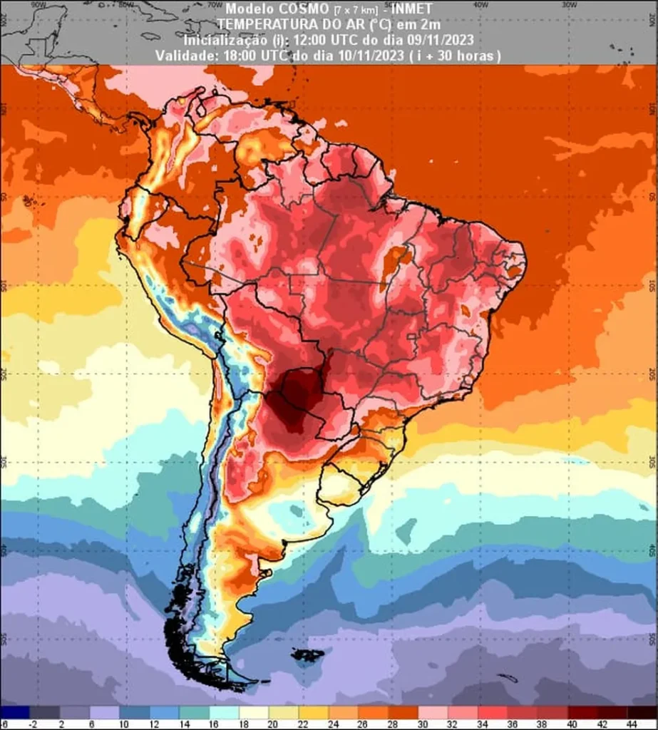 O Inmet afirma que as temperaturas máximas no Mato Grosso e no Mato Grosso do Sul devem atingir os 44 °C nos próximos dias. A previsão é de que várias cidades registrem recordes históricos de calor nesta semana.