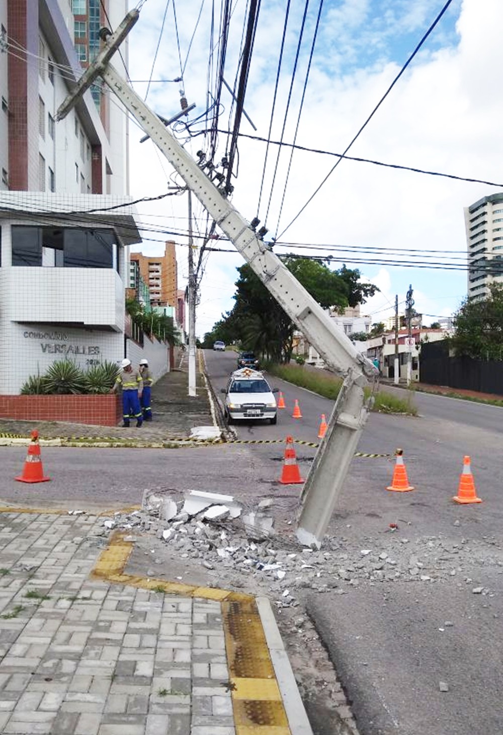 Um caminhão caçamba bateu e um poste ficou dependurado pelos fios na manhã desta sexta-feira (11) na Rua São José, no bairro de Lagoa Nova, na Zona Sul de Natal. Com a força do impacto, o poste partiu e foi arrancado do chão. Só não tombou no meio da pista porque ficou preso pela rede elétrica. Ninguém se feriu e o motorista fugiu do local.