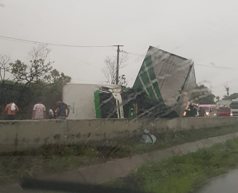 O caso aconteceu por volta de 16h30. Segundo a PRF, um caminhão era rebocado pelo outro, por meio de um cambão, quando deslizou e os dois colidiram. Chovia no momento do acidente.