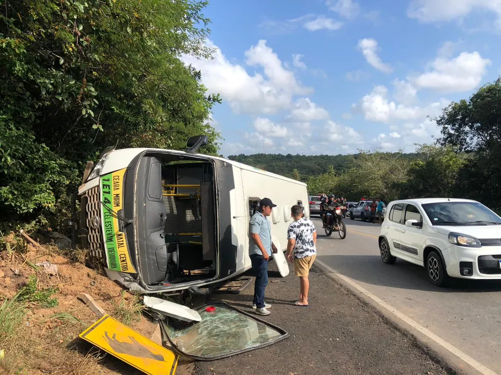 Após a batida, o micro-ônibus tombou na pista. O carro Gol ficou destruído.
