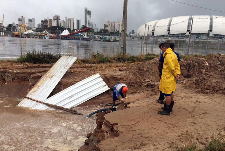 Com as fortes chuvas caídas ontem em Natal, um dos tubos da adutora da Caern, localizada no Centro Administrativo do Estado, desconectou com a forte pressão e jogou toda a água para o túnel da Avenida Capitão Mor Gouveia. O túnel foi fechado enquanto foram realizados os serviços de bombeamento da água acumulada. O tubo da Caern que desconectou tem uma potencia muito forte, o que fez a quantidade de água jogada na via ter sido tão expressiva. A água não danificou pavimentos ou outros equipamentos do entorno. “A questão maior foi somente o alagamento” informou o engenheiro Tomás Neto, da SEMOV. Os serviços por parte dos técnicos da Caern também foram executados no Centro Administrativo.