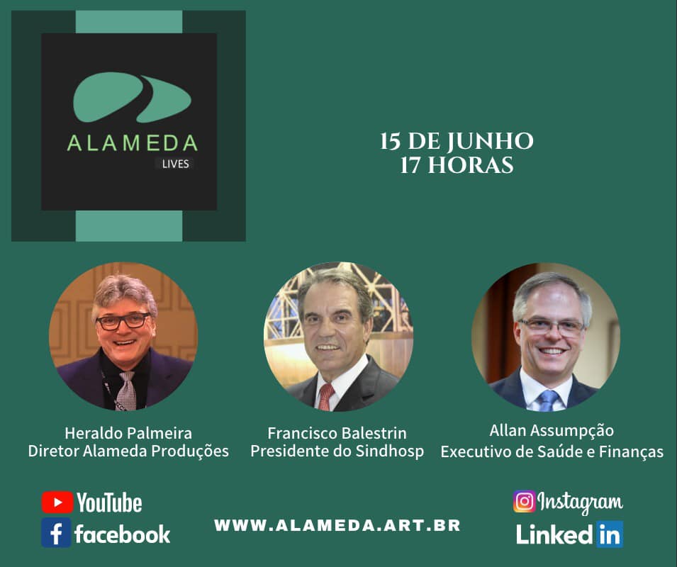 Hoje (15) é dia de live da Almeida Produções com o Heraldo Palmeira, Diretor da Alameda Produções, Francisco Balestrin, Presidente do Sindhosp e Allan Assumpção, Executivo de Saúde e Finanças.