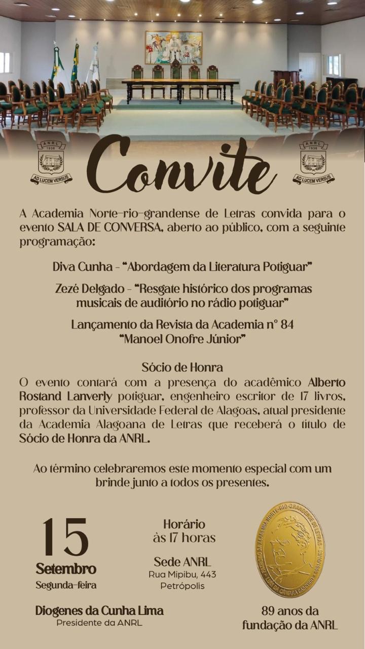 Nosso articulista Alberto Rostand Lanverly, presidente da Academia Alagoana de Letras receberá título de Sócio de Honra da ANRL, o evento ocorrerá na segunda-feira (15).