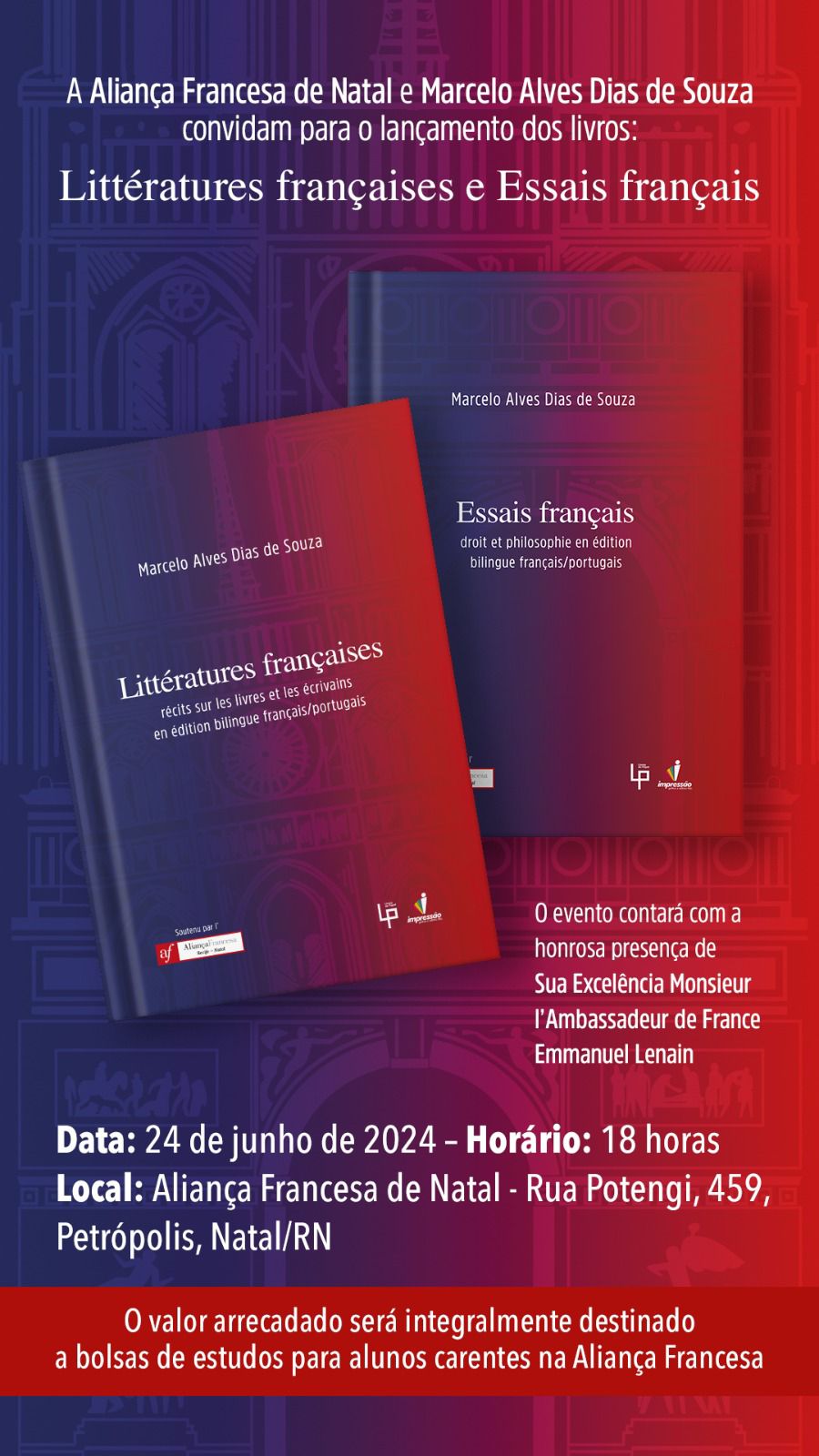 A Aliança Francesa de Natal e Marcelo Alves Dias de Souza (autor) convidam para o lançamento dos livros: Essais français e Littératures françaises.