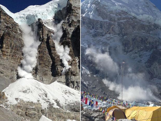 Uma equipe brasileira que escala o Everest, o pico mais alto do mundo, registrou imagens de uma avalanche na montanha, que fica na cordilheira do Himalaia, na fronteira entre o Nepal e a Índia. Em fotos tiradas pelo fotógrafo e cinegrafista Marcelo Rabelo nesta quinta-feira (18), ele acompanha a médica Karina Oliani, numa expedição de 55 dias pela região, que incluirá a subida ao topo do pico. A dupla está na base da montanha passando por uma fase de aclimatação.Segundo Oliani, a avalanche não deixou vítimas, mas destruiu parte da trilha da subida. A médica disse ainda que o fenômeno é causado pelo clima seco, e que ocorre com frequência na área.