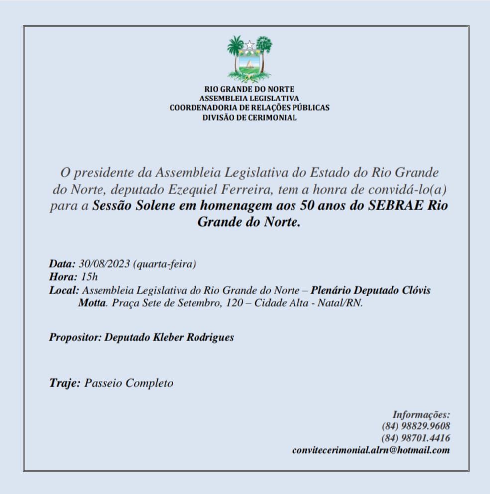 A Assembleia Legislativa do Rio Grande do Norte homenageia na próxima quarta-feira (30) os 50 anos do Sebrae Rio Grande do Norte, em sessão solene na casa, proposta pelo deputado Kleber Rodrigues. O evento ocorre no Plenário deputado Clóvis Motta, na sede da ALRN, às 15h.