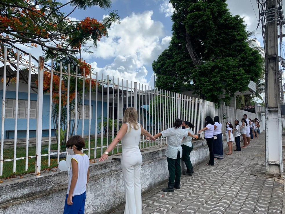 Vestindo branco, funcionários, pais e alunos da Escola Estadual Dr. Manoel Dantas, no bairro Tirol, em Natal, realizaram um abraço simbólico à instituição, que já foi alvo de três arrombamentos em 2020. O ato aconteceu na manhã desta quarta-feira (11).
