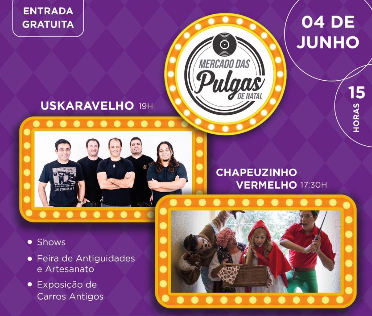 Neste domingo o Mercado das Pulgas de Natal apresenta o espetáculo “Chapeuzinho Vermelho” do grupo Era Uma Vez e ainda muito rock nacional com o UsKaravelho. A entrada é gratuita e o lazer é garantido com espaço para esportes, praça de alimentação, ambiente para os pets, exposição e feiras de artesanato e antiguidades. O Mercado é realizado desde abril na Arena das Dunas, sempre às 15h. Em todas as edições, shows, apresentações e muitas coisas para curtir com amigos e familiares. Já às 19h, a galera da banda UsKaravelho domina o palco do Mercado com o melhor do rock nacional com promessa de não deixar ninguém parado. Com 16 anos de história, a banda é composta por Clênio Maciel na voz, Eduardo Passaia nas guitarras e violão, Jeff Soares no baixo e voz, Cléo Lima na guitarra, violão e voz e Júnior Cavallo na bateria.