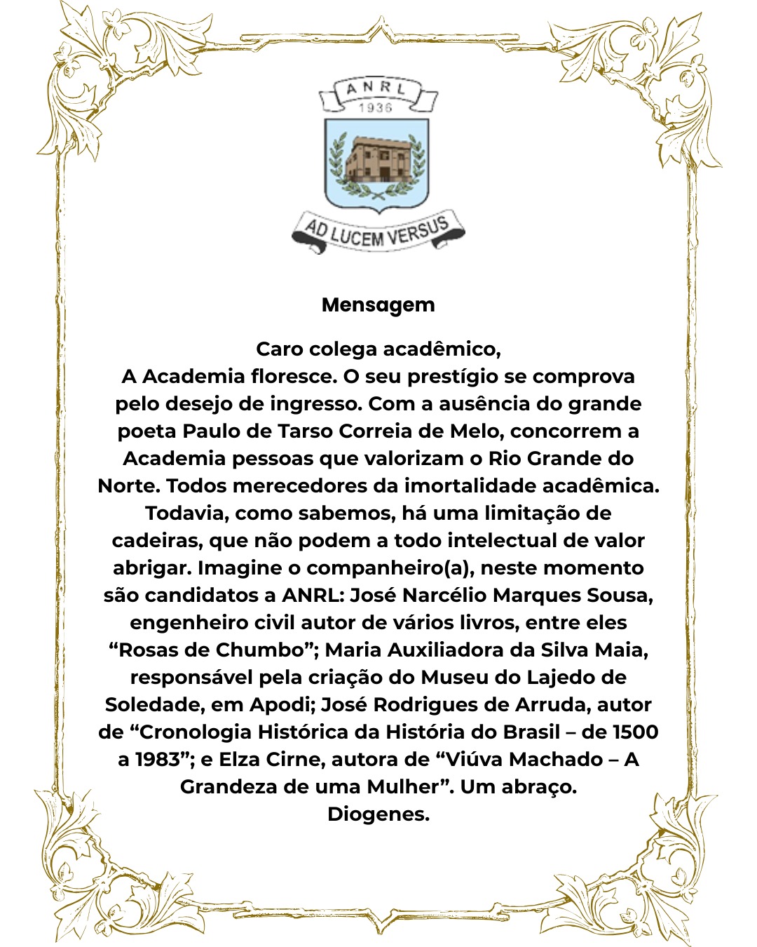 A Assembleia Norte-riograndense de Letras seleciona novos candidatos a ingressar a imortalidade. Dentre os nomes prestigiados está o de José Narcélio Marques Sousa, nosso articulista.