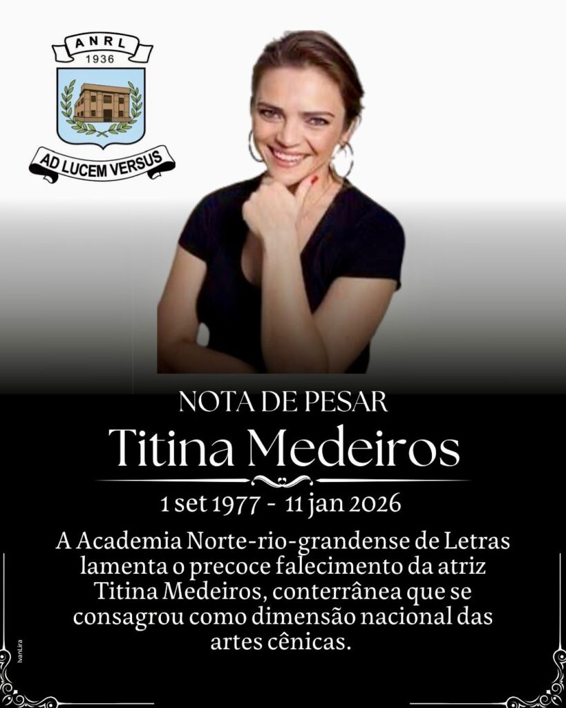 O pesar da Academia Norte-rio-grandense de Letras pelo falecimento da atriz e comunicadora social TITINA MEDEIROS, que ampliou o nome do RN no cenário artístico brasileiro.
