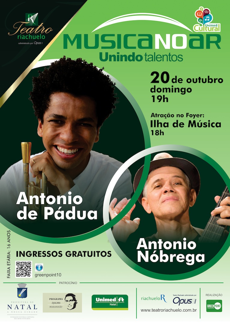 O Música NO AR – Unindo Talentos, que tem o patrocínio da Unimed Natal e da Prefeitura do Natal via Lei Djalma Maranhão de Incentivo à Cultura, é uma realização da Green Point Produções que, como já é de praxe em seus projetos, reserva uma cota de 150 ingressos sociais para jovens de escolas públicas e integrantes de projetos sociais.