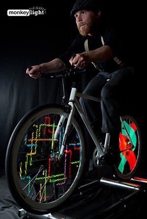 Para quem gosta de andar de bicicleta principalmente no período da noite, uma empresa da Califórnia desenvolveu um sistema de luzes de LED que são colocadas nas rodas e que, ao pedalar, apresenta imagens coloridas ou animações. Este conteúdo que aparece nas rodas pode ser personalizado. Chamado de Monkey Light Pro, da MonkeyLectric (clique aqui para acessar o site do Kickstarter), o sistema usa quatro fileiras de lizes de LED resistêntes à água que são colocadas nas rodas. Um programa especial permite criar e transferir as animações para as luzes acopladas às rodas. A transferência é feita por meio de Bluetooth.