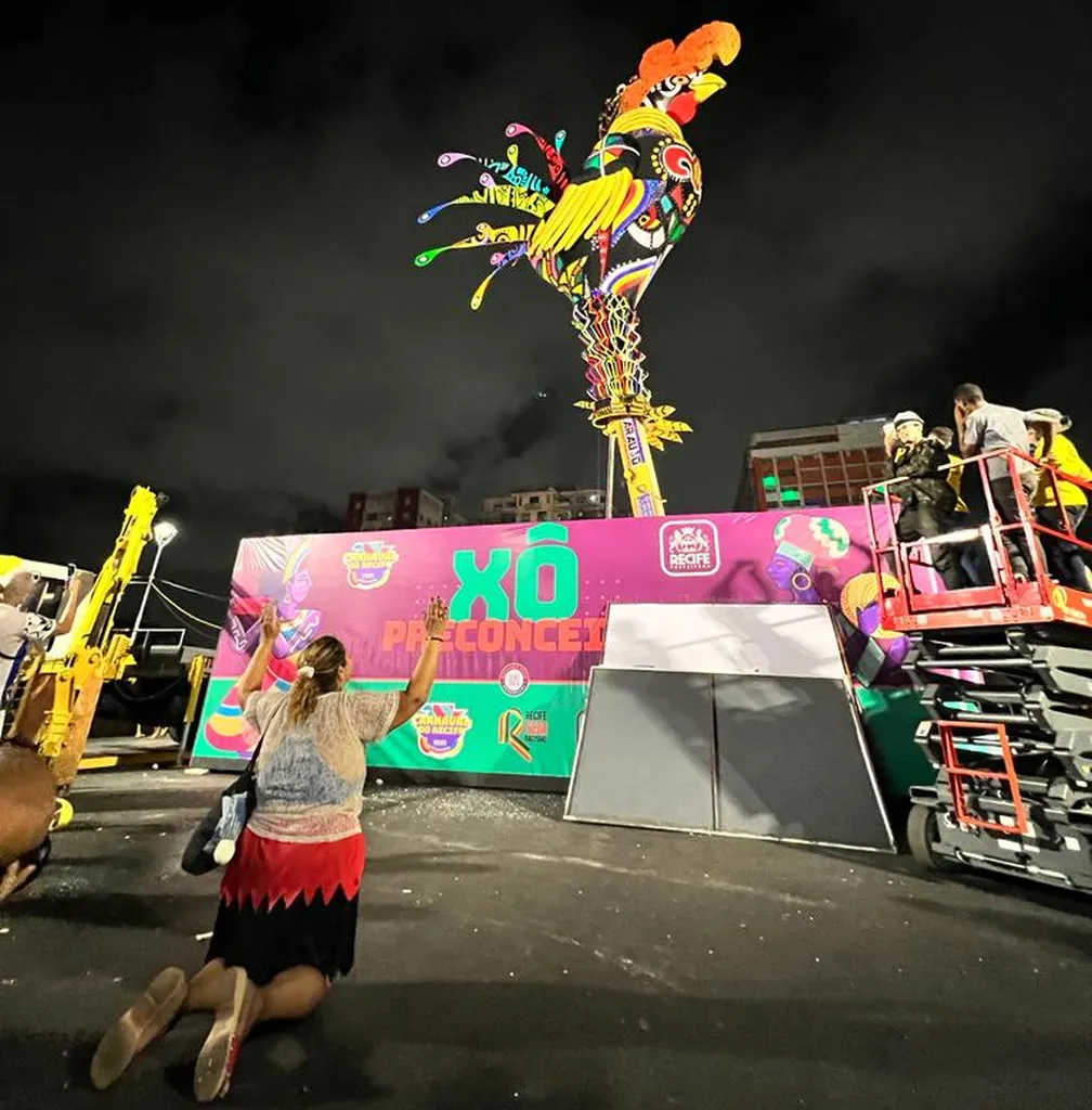 Após dois anos sem carnaval por causa da pandemia da Covid-19, o Galo gigante, símbolo da festa em Pernambuco, voltou a reinar na Ponte Duarte Coelho, no Centro do Recife. A alegoria gigante foi erguida por volta das 22h desta quinta-feira (16), aos gritos de “sobe, sobe” e “Galo, eu te amo” das pessoas que presenciaram esse momento tradicional da folia.