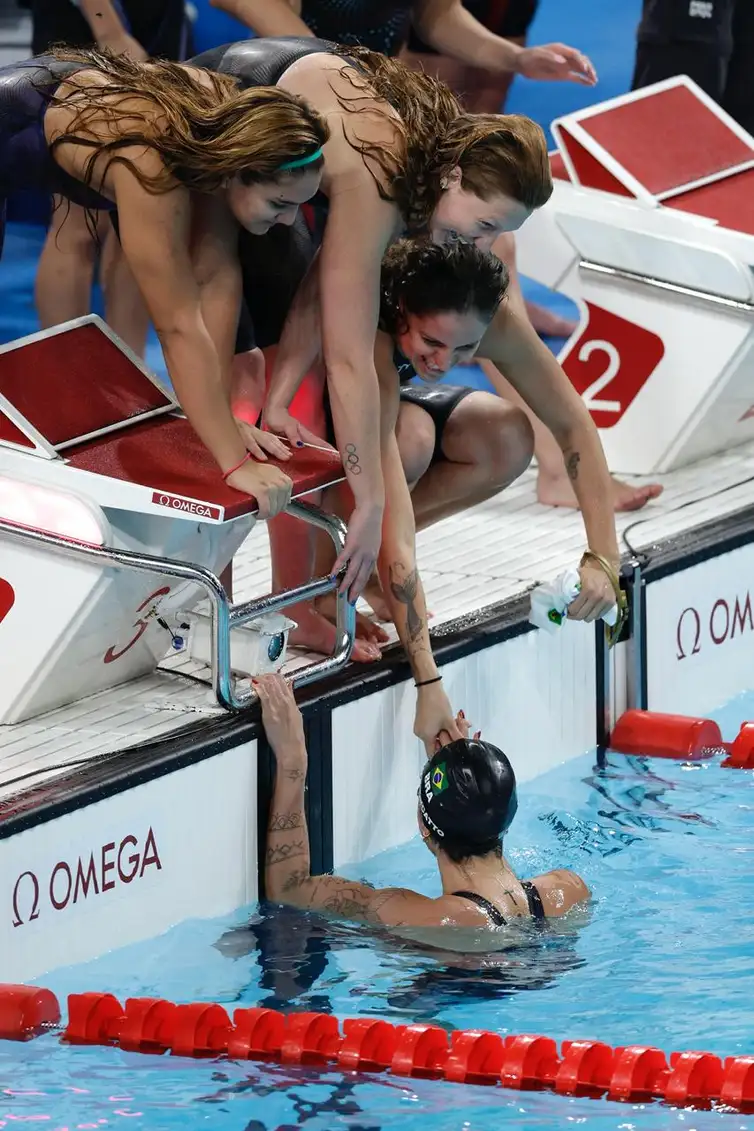 “Eu estou bem feliz. Acho que o time nadou muito bem. Acho que tem muito espaço pra melhorar ainda, o que é bom né. O problema é quando não tem espaço para melhorar. Fato é que a gente pode melhorar. A gente está em uma boa colocação. E sonhar… É minha primeira final olímpica. Eu acho que nadar e ver o público depois de Tóquio, quando não tinha ninguém, vai ser incrível!”, comemorou Stephanie Balduccini.