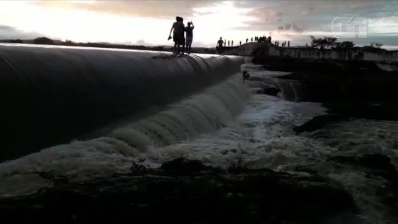 O Açude Dourado em Currais Novos, no Seridó potiguar, transbordou na madrugada desta terça-feira (3). A sangria foi comemorada pelos moradores da cidade, que se aglomeraram nas margens do reservatório. As fortes chuvas que caíram na região encheram o açude em 5 dias. Na segunda-feira (2), o açude estava 81% cheio.