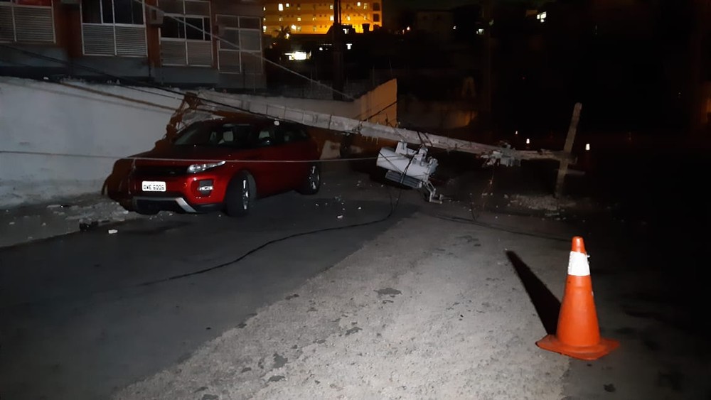 O impacto foi tão forte que o poste caiu sobre o veículo. Apesar disso, nem o condutor, nem o filho dele, uma criança de 9 anos que estava no automóvel, se feriram.