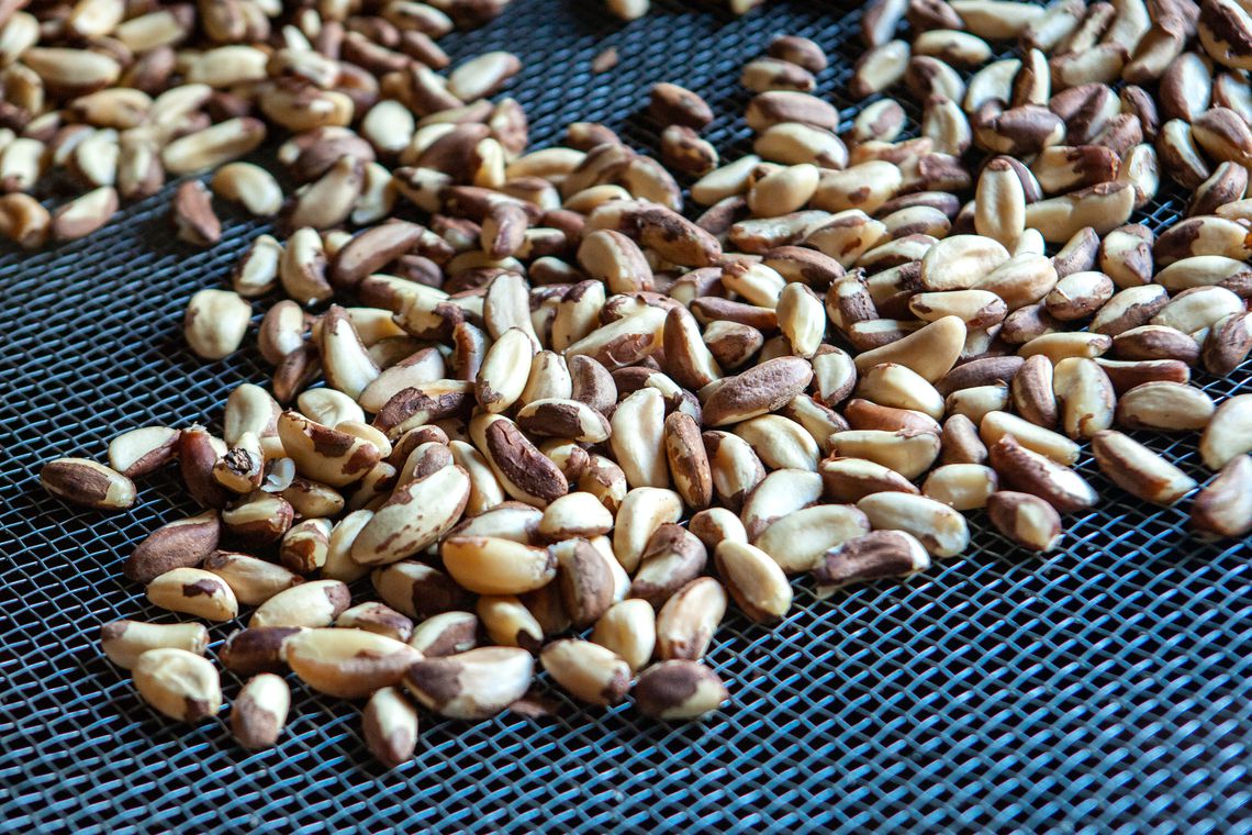 Castanhas na mesa de triagem. Processamento da castanha na mini usina da Comunidade do Rio Novo, um afluente do rio Iriri na Terra do Meio.