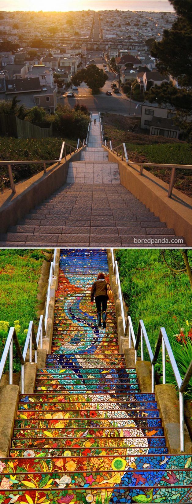 A arte de rua é capaz de tornar momentos tediosos bem mais alegres. Não é demais quando você está tendo um dia ruim, decide fazer um caminho diferente para mudar e encontra uma obra de arte até então desconhecida? Veja aqui apenas uma dessas intervenções, feitas numa escadaria, o que demonstra que intervenções artísticas são capazes de transformar todo o entorno dos locais. Uma boa ideia para algumas escadarias sombrias de alguns locais em nossa cidade Natal.