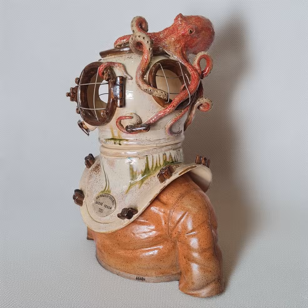 Segundo André, a escultura é oca e exige um processo complexo de produção. “Essa peça é feita com uma técnica mista. Ela é feita de cobrinhas, que é a técnica do acordelado. Eu vou modelando cobrinha por cobrinha até encontrar o formato do escafandro. Depois, os outros detalhes são todos feitos à mão, sem molde, sem nada”, explicou.