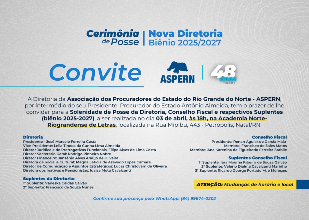 A ASPERN realiza nesta quinta-feira (03) a cerimônia de posse, às 18h, na Academia Norte-riograndense de letras, no bairro de Petrópolis.