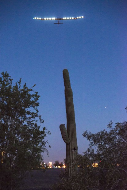 O Solar Impulse, primeiro avião tripulado que voa de dia e de noite exclusivamente com energia solar bateu, nesta quinta-feira (23), um novo recorde ao completar a segunda etapa da sua travessia pelos Estados Unidos. Foram percorridos 1.541 quilômetros, a maior distância já cumprida por um avião solar. O recorde anterior também havia sido alcançado pela aeronave há um ano, quando completou o percurso de 1.116 quilômetros entre a Suíça e a Espanha. O projeto, idealizado e comandado por dois pilotos suíços, tem como objetivo demonstrar o que pode ser conquistado sem combustíveis fósseis. A meta é que a aeronave possa realizar um voo ao redor do mundo em 2015.