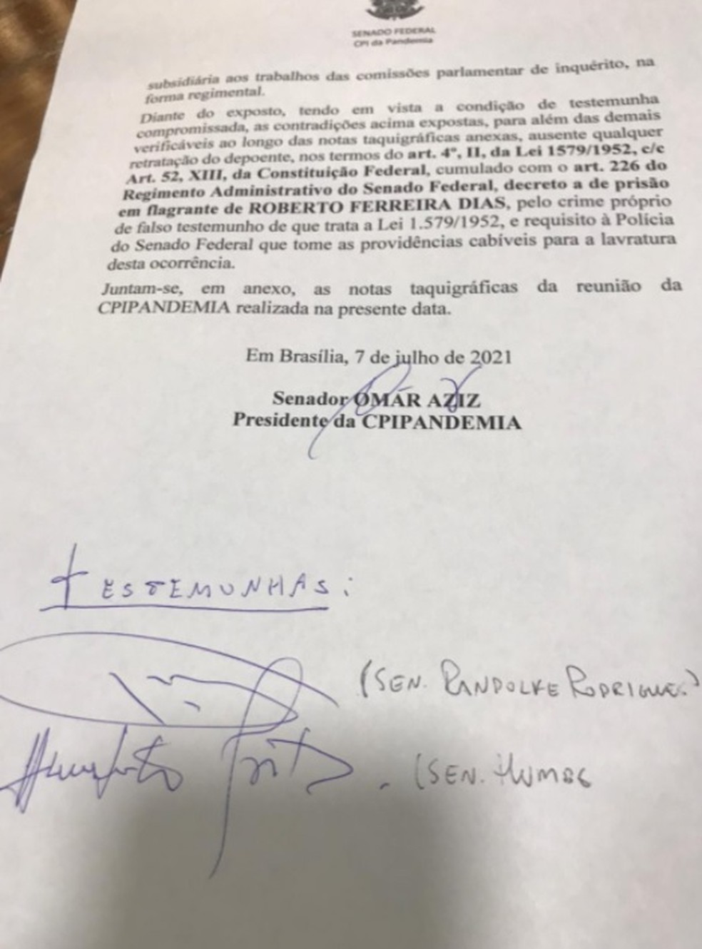 O presidente da CPI da Covid, senador Omar Aziz (PSD-AM), determinou nessa quarta-feira (7) a prisão do ex-diretor de Logística do Ministério da Saúde Roberto Dias. Segundo Aziz, a decisão foi tomada porque Dias mentiu e cometeu perjúrio durante o depoimento, isto é, violou o juramento de falar de verdade.