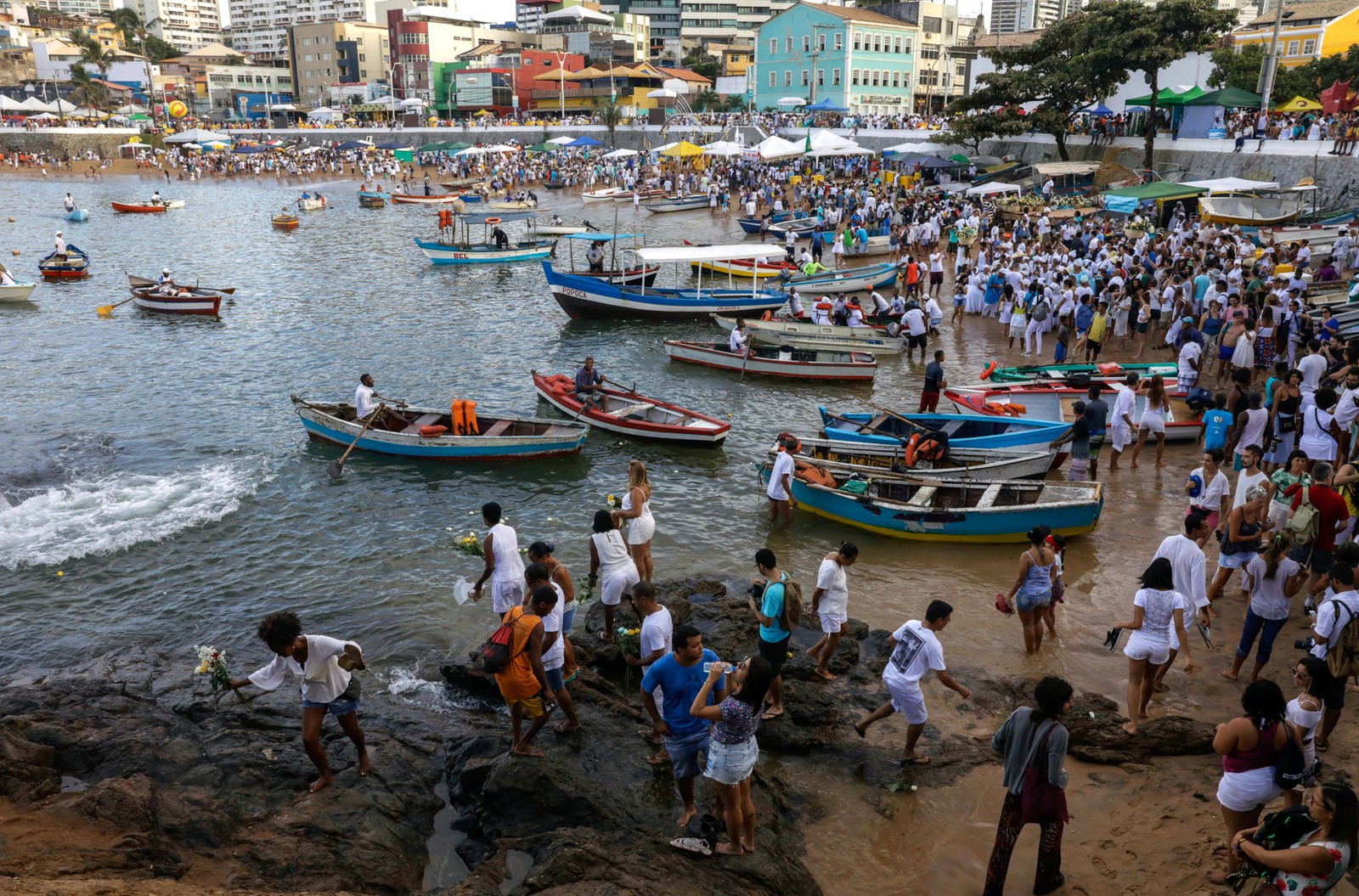 Por volta das 5h, uma alvorada de fogos de artifício marcou a chegada do presente principal ao Rio Vermelho. A celebração é uma das principais do calendário de festas populares da Bahia.