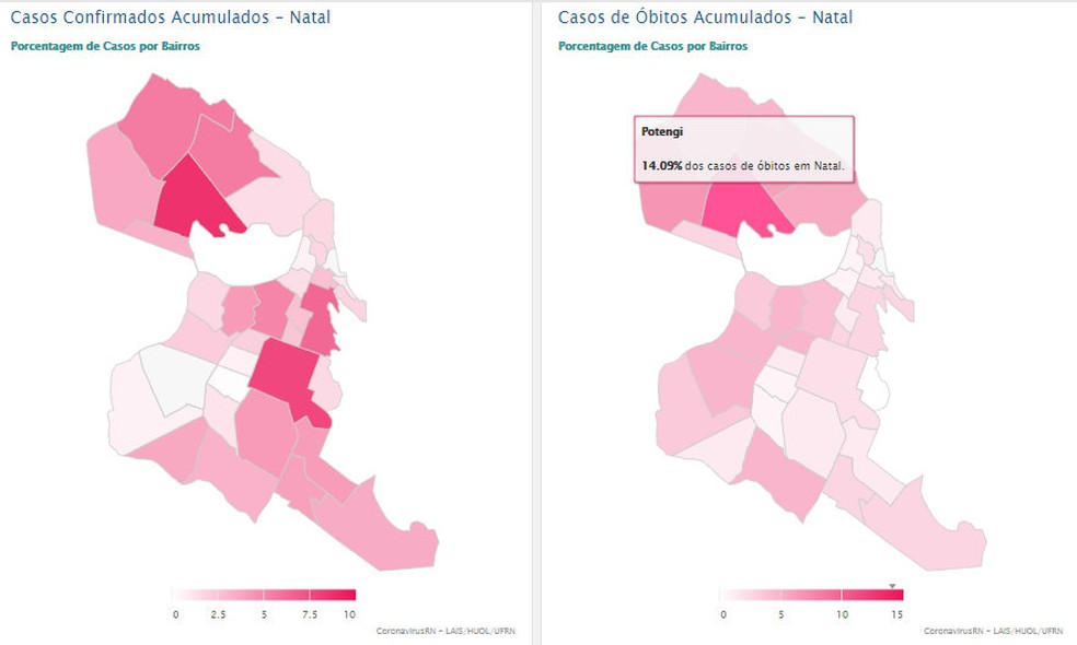 Dados apresentados pelo Laboratório de Inovação Tecnológica em Saúde da Universidade Federal do Rio Grande do Norte (LAIS/UFRN) apontam que 39,59% das mortes por Covid-19 em Natal estão concentradas nos bairros da zona Norte. Os números, divulgados em parceria com a Secretaria Estadual de Saúde Pública (Sesap), foram atualizados nessa terça-feira (16), na plataforma Coronavírus RN.