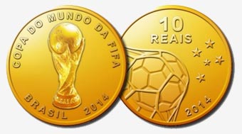 O Banco Central (BC) vai lançar no dia 24 de janeiro de 2014 uma série de moedas comemorativas oficiais da Copa do Mundo. Ao todo, serão nove moedas especiais, destinadas a colecionadores: uma de ouro, duas de prata e seis de cuproníquel – liga metálica de cobre e níquel. A moeda de ouro faz alusão à taça da Copa do Mundo e ao momento do gol. Uma das moedas de prata apresenta o mascote oficial do campeonato, o tatu Fuleco, e a outra homenageia as 12 cidades-sede da competição. Já as moedas de cuproníquel compõem a série Jogadas do Futebol, retratando lances típicos do esporte: a defesa do goleiro, a cabeçada, a matada no peito, o passe, o drible e o gol. Também deverá ser comercializada, a partir de março, uma cartela com o conjunto das seis moedas de cuproníquel.