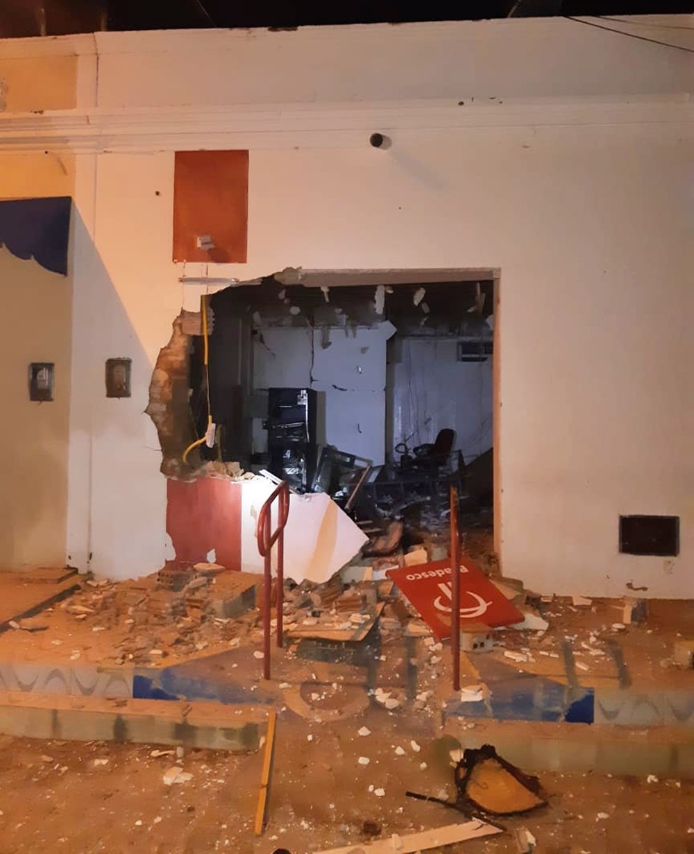 Os criminosos usaram dinamite para arrombar o terminal. Parte da agência ficou destruída com a força da explosão.