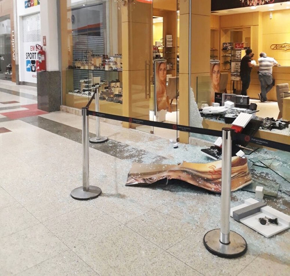 De acordo com a PM, os assaltantes pularam a cerca do estacionamento por volta das 3h. Depois, renderam o vigilante que passava pelo local e entraram no shopping. Eles ainda quebraram as vitrines de duas loja de produtos eletrônicos e de uma relojoalheria.