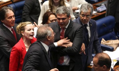 O presidente do Senado, Renan Calheiros (PMDB-AL) deu uma longa entrevista na tarde de hoje, afirmando que considerou desproporcional o ataque sofrido por ele por parte da senadora Gleisi Hoffmann (PT-PR). Contudo, o senador admite que sua resposta a petista também foi exagerada. “O que está incomodando é o fato de, até as vésperas de um julgamento que já dura oito meses, eles não saibam como o presidente da casa vai voltar. “Ele garantiu, no entanto que não antecipará a sua posição. “Eu não gosto de me explicar, eu prefiro que vocês me interpretem.” Renan acha que o prolongamento das falas das testemunhas está desgastando a defesa da presidente Dilma. “Do ponto de vista político, essa confusão só tira votos”, afirmou ele. Renan lembrou que agiu em relação ao episódio da senadora Gleisi Hoffmann para ajudar a instituição. “Ela e o senador Lindberg me agradeceram por isto em plenário”, provocou ele. Renan afirmou ainda que na próxima segunda-feira a comitiva da presidente Dilma terá cerca de 20 pessoas e que reservou um espaço semelhantes para aqueles que defendem o impeachment.