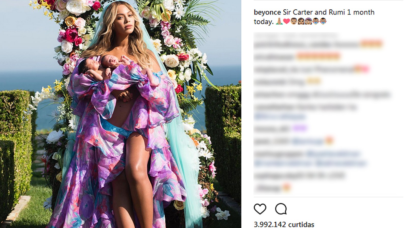 A cantora Beyoncé divulgou em sua conta no Instagram na madrugada desta sexta-feira (14) a primeira foto com seus bebês gêmeos Sir Carter e Rumi para comemorar o primeiro mês de nascimento das crianças. Em pouco mais de 5 horas, a publicação teve mais de 4 milhões de curtidas e milhares de comentários dos fãs.