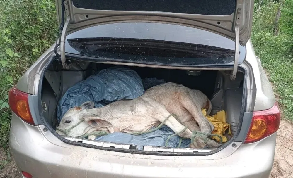 Policiais militares encontraram um bezerro dentro do porta-malas de um carro atolado na região do Litoral Leste potiguar, neste domingo (21). O animal tinha sido furtado momentos antes de uma fazenda. Quatro suspeitos foram presos.