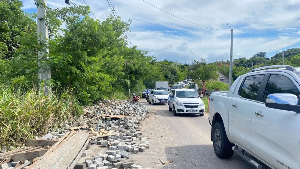Uma carga de blocos de concreto pré-moldados caiu de um caminhão na tarde desta quarta-feira (22) e invadiu a pista da Avenida Olavo Montenegro, em Parnamirim, na Grande Natal. Com isso, o trânsito ficou lento no local.