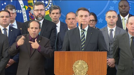 Bolsonaro fez a manifestação no Palácio do Planalto, de pé, acompanhado de ministros do governo.