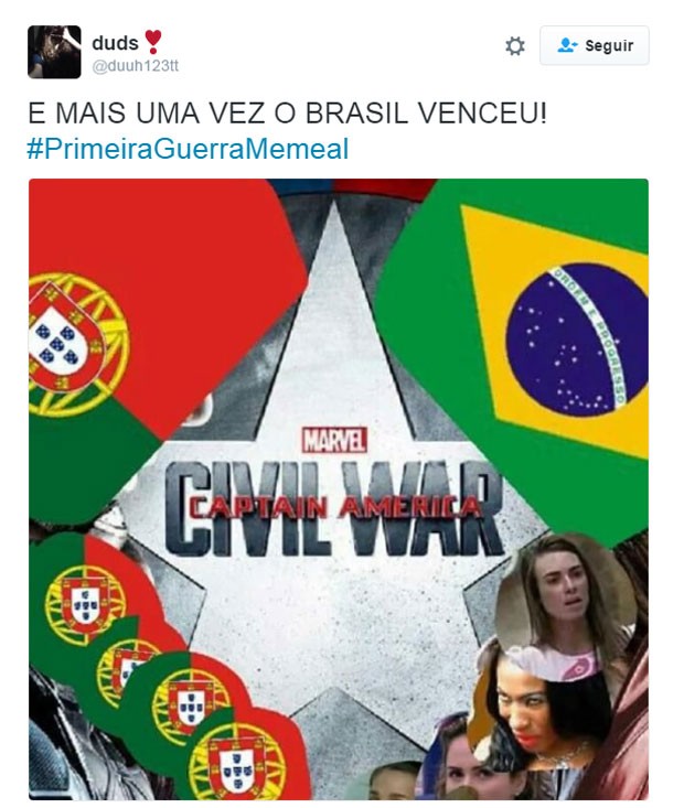 Após um fervoroso embate na internet, os usuários brasileiros do Twitter passaram a reivindicar hoje (15) a vitória da “guerra de memes” contra Portugal, que tomou a rede social. O assunto continuou a ser um dos mais comentados do microblog em todo o mundo. Mas, se antes a disputa era identificada pela expressão “BR x PT”, a autoproclamada vitória brasileira passou a ser celebrada com a hashtag “#PrimeiraGuerraMemeal”.