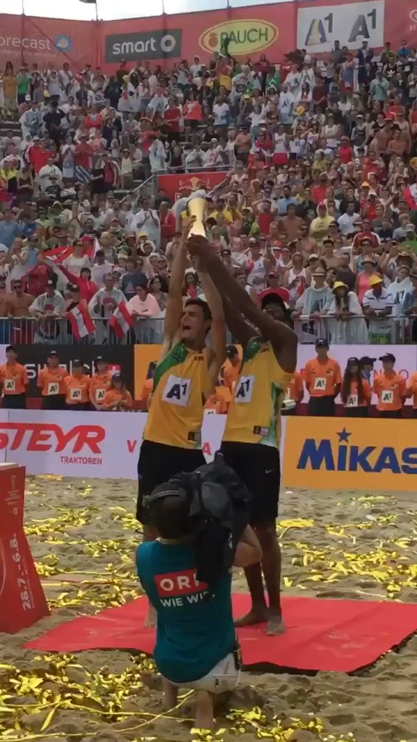 O título masculino do Campeonato Mundial de vôlei de praia ficou com a dupla brasileira Evandro e André Stein. Esta foi a sétima vez na história que o Brasil vence a dispita. Dois anos antes Alison/Bruno Schmidt conquistaram o ouro na Holanda diante da dupla holandesa Nummerdor/Varenhorst. Hoje, o carioca Evandro e o capixaba André repetiram o feito na Áustria, jogando numa arena lotada. A dupla brasileira não se intimidou diante de 10 mil espectadores que apoiavam os austríacos Clemens Dopller/Alexander Horst. O placar foi de 2 sets a 0, no primeiro título mundialde André e Evandro, que formaram a dupla no início deste ano.