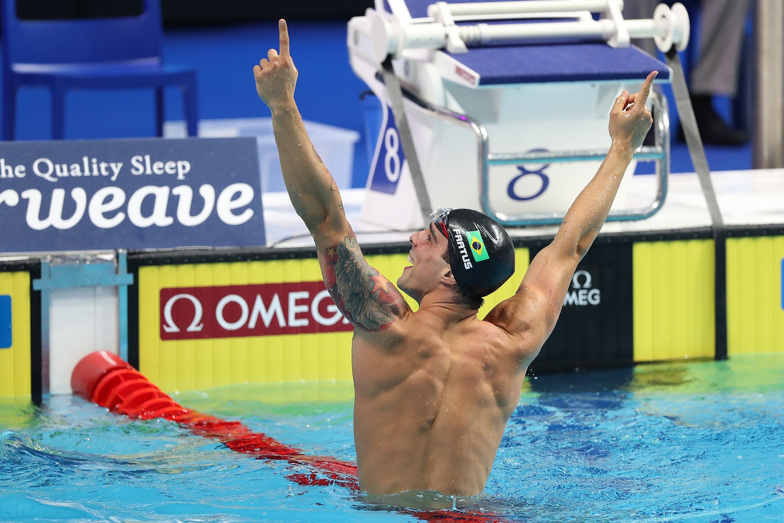 Onze meses depois de sair decepcionado da Olimpíada do Rio com o sexto lugar, Bruno Fratus se redimiu e acabou com “o pesadelo”, segundo suas próprias palavras. Com uma constância impressionante em toda a temporada, ele mostrou na final do Mundial, realizada nesse sábado (29), que continua em forma. Pela segunda vez seguida, foi ao pódio em um Campeonato Mundial, desta vez levando a prata na prova dos 50m livre em Budapeste, na Hungria, melhorando um degrau com relação a Kazan 2015. Sua marca, 21s27, é a melhor de toda sua carreira, superando em um décimo o antigo resultado. Caeleb Dressel venceu com 21s15. Cielo fechou em oitavo com 21s83.