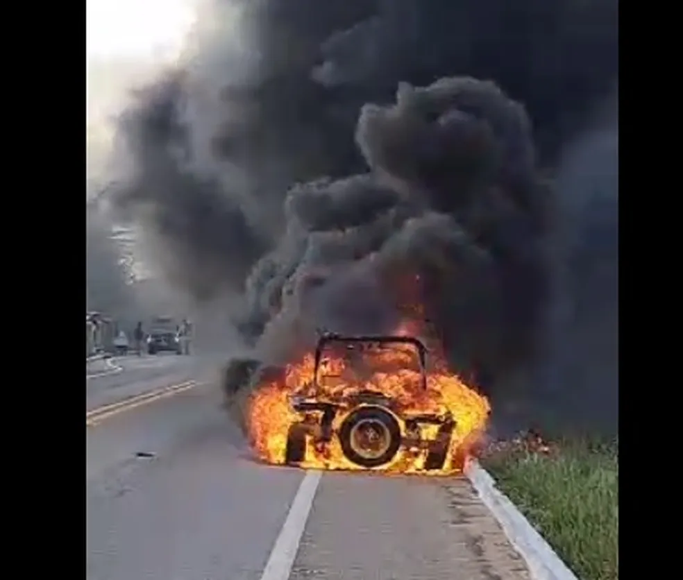 Um buggy ficou destruído após pegar fogo na tarde desta segunda-feira (17) na BR-101 em Extremoz, na Região Metropolitana de Natal. Ninguém ficou ferido.