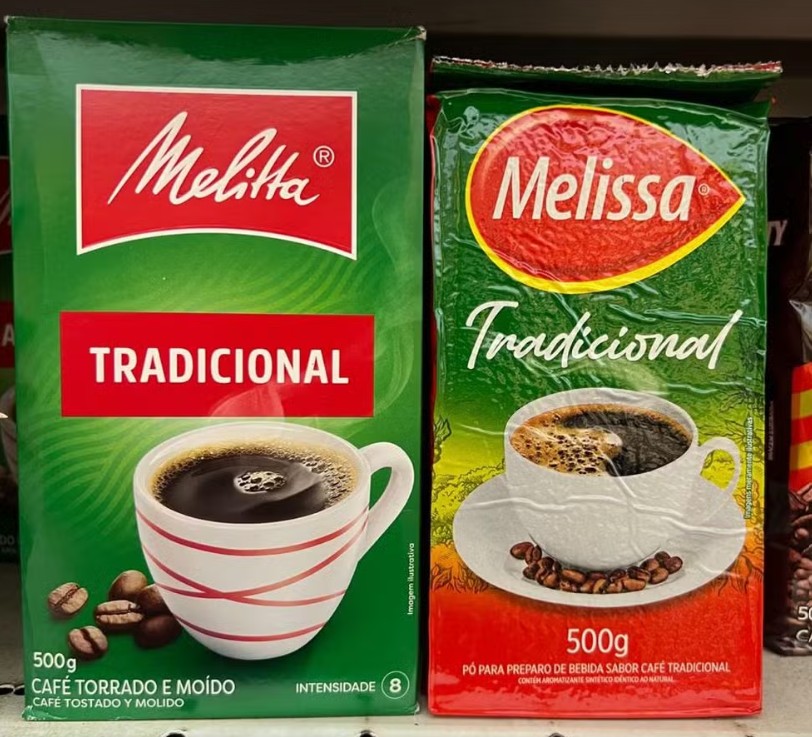 Apesar de informar na embalagem que se trata de um “pó sabor café”, as marcas trazem fotos de uma xícara de café, acompanhada por grãos — além de imitar cores, fontes e terem nomes similares às marcas populares.