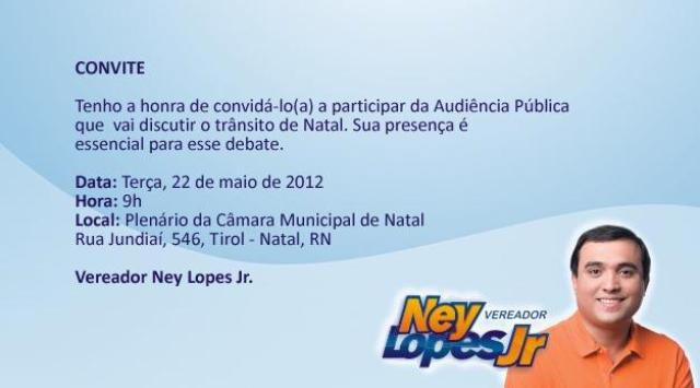 O propositor explica a importância da audiência, “Essa semana Natal parou por causa da greve dos rodoviários. Entretanto, os problemas não se resumem a apenas isto, a cidade há tempos sofre com o trânsito desordenado e caótico. O poder público não pode ficar inerte a esta realidade. O cidadão é que tem sentido na pele, a falta de investimento e ações, para melhorar a mobilidade urbana. Na audiência discutiremos sugestões para aperfeiçoar esta situação”, declara o vereador Ney Lopes Jr.
